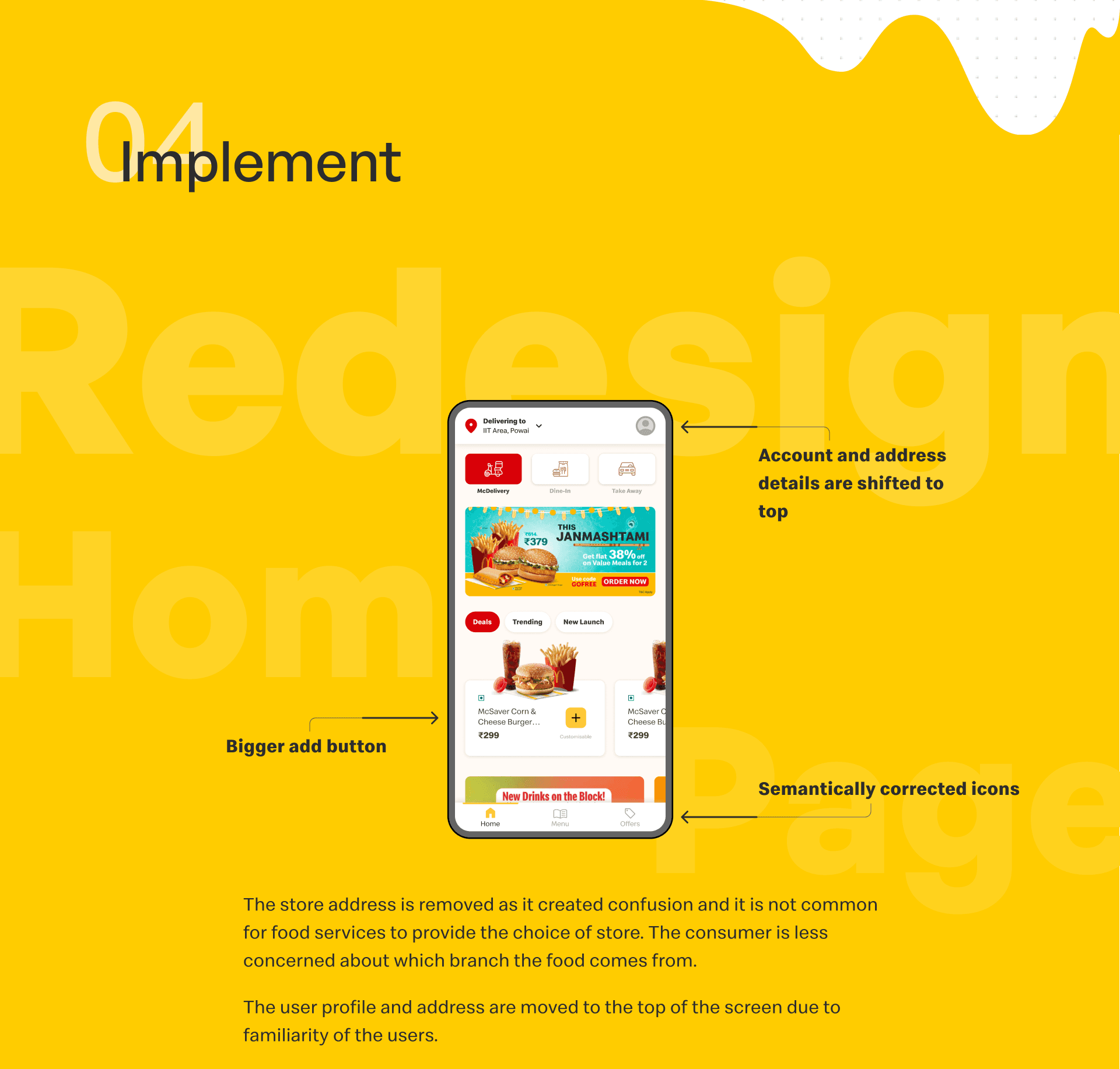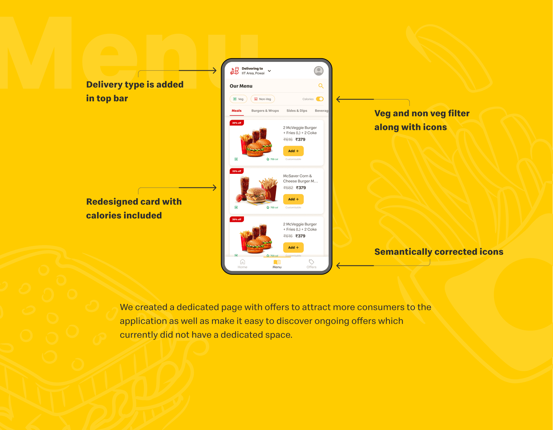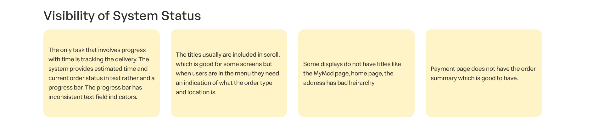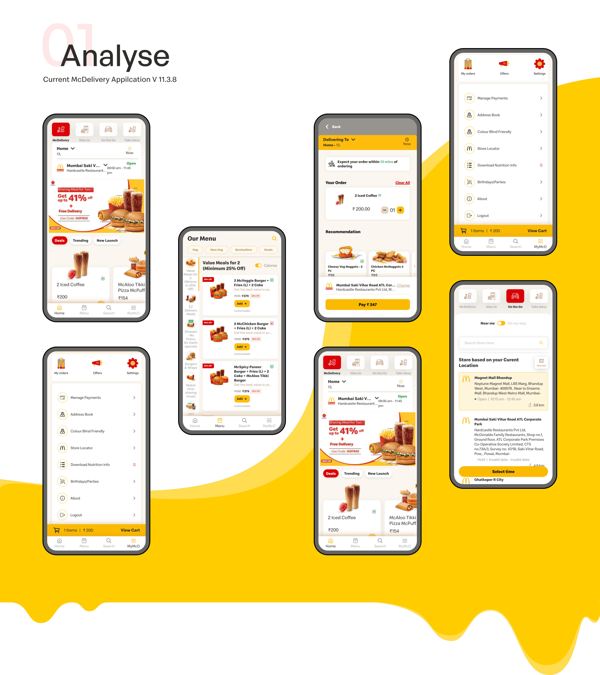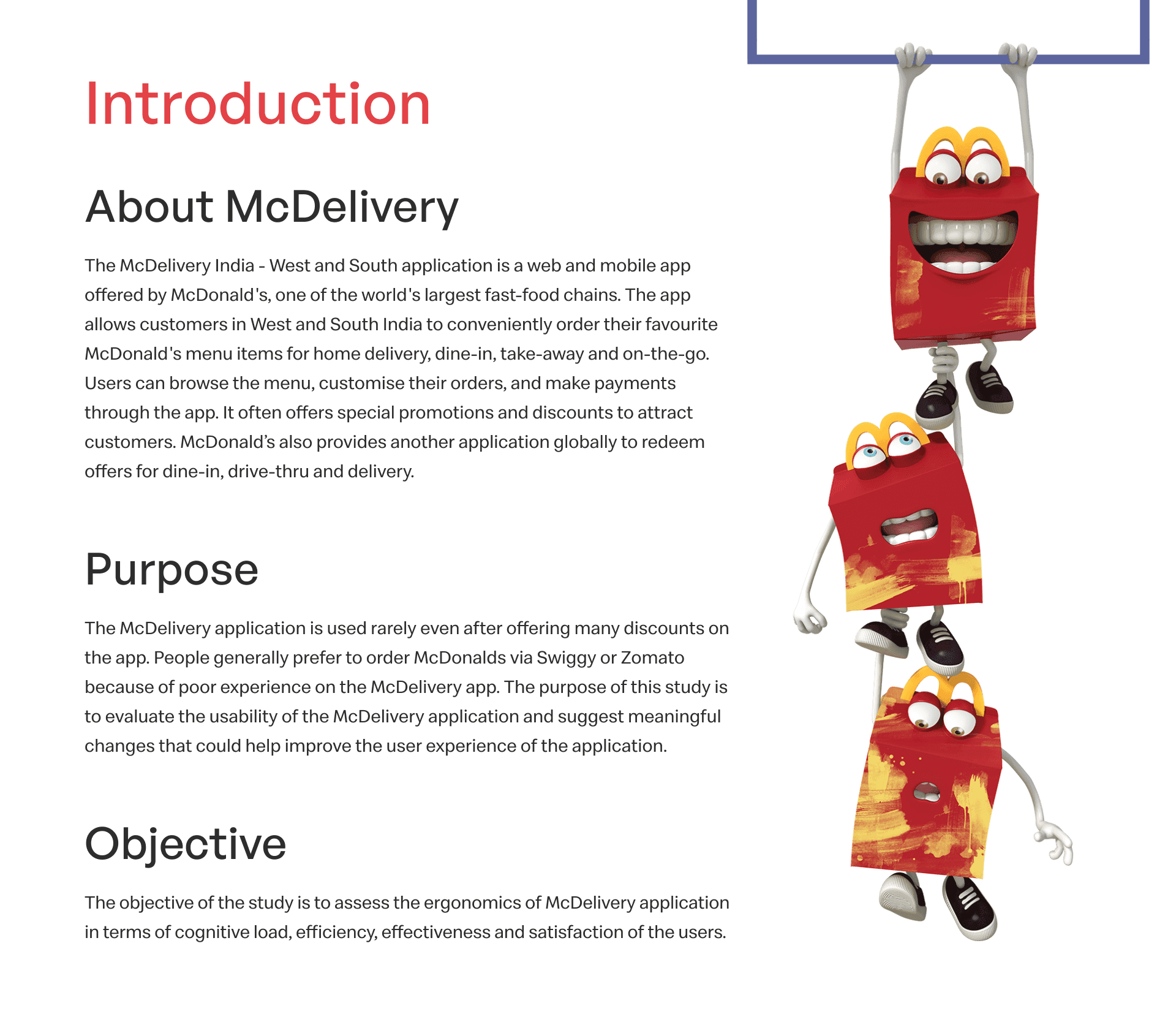 The McDelivery application is used rarely even after offering many discounts on the app. People generally prefer to order McDonalds via Swiggy or Zomato because of poor experience on the McDelivery app. The purpose of this study is to evaluate the usability of the McDelivery application and suggest meaningful changes that could help improve the user experience of the application.